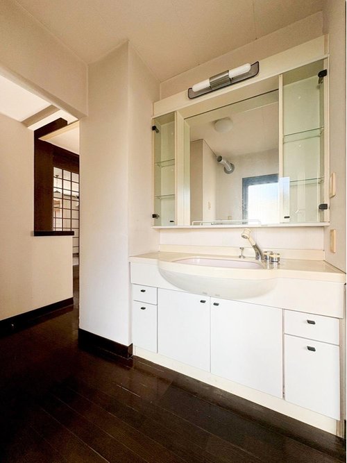 【1階洗面所です】 洗面スペースが広いので、家族同時に使いやすいのが大きな魅力。忙しい朝でもストレスが減ります。引き出しや収納が多く、タオル・洗剤・ストック類をまとめて収納できます。