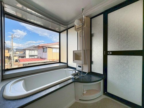 【2階浴室です】 2階にあるので、大きな窓から周囲の目を気にせず、ゆっくり入浴する事ができます。換気も2階なので防犯上も安心です。
