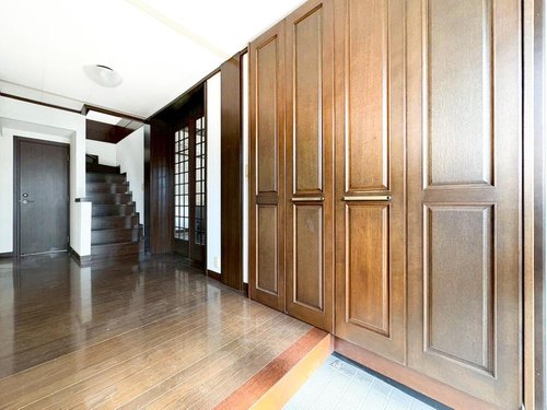壁一面の収納で靴は勿論、日常のコートなども収納できます。ごちゃごちゃしがちな玄関周りもすっきり整理整頓できます。南からの日差しが入る明るい玄関です。