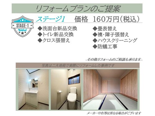 リフォームプラン【ステージ1】のご提案です。追加160万円でトイレ・洗面新品交換、クロス張替え、防蟻工事等々のリフォームが可能です。リフォームに関してのご相談もお気軽にお問い合わせください♪