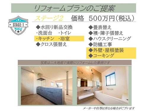 リフォームプラン【ステージ2】のご提案です。追加500万円で水回り新品交換、クロス張替え、外壁・屋根塗装等々のリフォームが可能です。リフォームに関してのご相談もお気軽にお問い合わせください♪