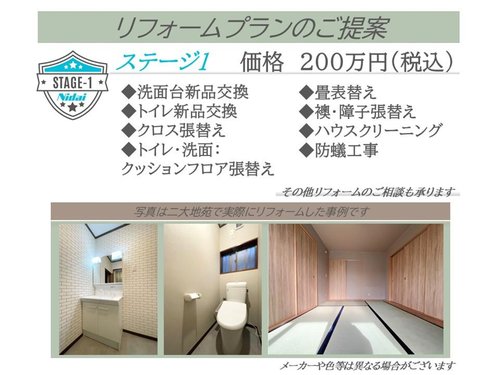 リフォームプラン【ステージ1】のご提案です。 追加200万円でトイレ・洗面新品交換、クロス張替え、防蟻工事等々のリフォームが可能です。 リフォームに関してのご相談もお気軽にお問い合わせください♪