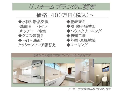 400万円のリフォームプランご用意しています。 内容は、水回り新品交換、クロス張替え、畳表替え、外壁塗装、防蟻工事他を行います。ご自分でカスタマイズできますのでお気軽にご相談下さい。