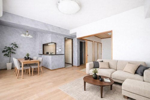 【リフォームして家具配置したイメージ画像です】 クロス、床CF上張りをして家具を配置したイメージCG画像です(クロス張替え、床上張りもイメージです。実際に家具はつきません)。南向きで見晴らし良好です。