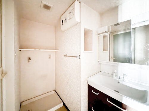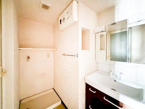 【ハウスクリーニングして綺麗にします】三面鏡で身支度しやすい洗面台。洗濯機置き場や洗面台横に造作の棚が付いて便利です。シャワーハンドルが付いて朝シャンやお掃除にも大変便利にお使いいただけます。