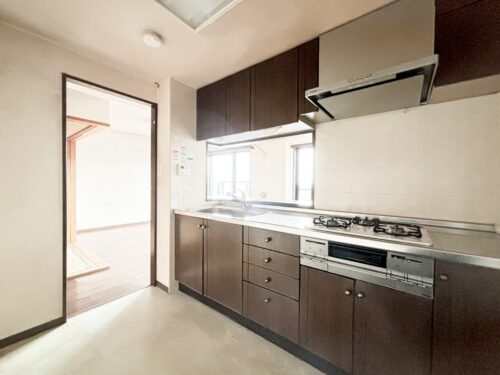 【ハウスクリーニングして綺麗にします】ダークブラウンの落ち着いた対面キッチン。収納豊富で使いやすい設計。広々とした作業台でお料理の腕もあがります。リフォームのご相談もお気軽にご相談下さい。