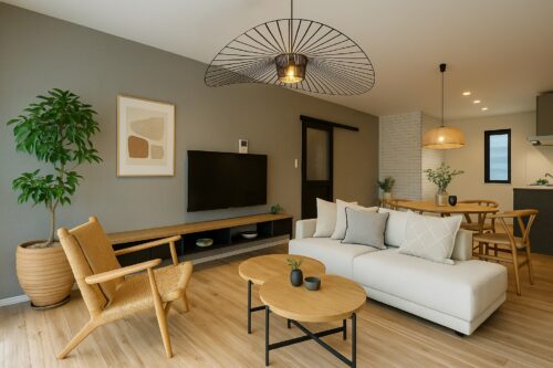 ダイニングテーブルやソファリビングに家具をイメージしたCG写真になります(※実際には家具はつきません)の配置を考えるのも楽しみですね。 リビングと1F廊下の床はペット専用のクッションフロアを使用しているので、ペットと一緒に過ごすのも快適です♪