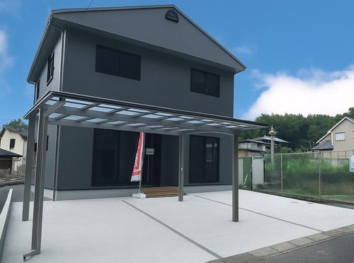 【外壁塗装イメージ図】 外壁を今流行りのダークグレーで塗装したイメージ画像です。 屋根カバー工法完了しました。 駐車場コンクリート、カーポート設置工事完了しました。