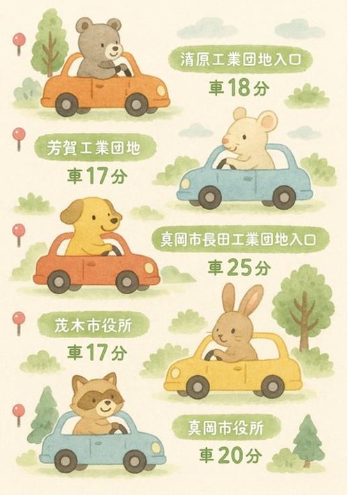 \工業団地まで車で30分以内!通勤にも◎な静かな戸建て/ ・清原工業団地入口 車18分 ・芳賀工業団地 車17分 ・真岡市長田工業団地入口 車25分 ・茂木市役所 車17分 ・真岡市役所 車20分