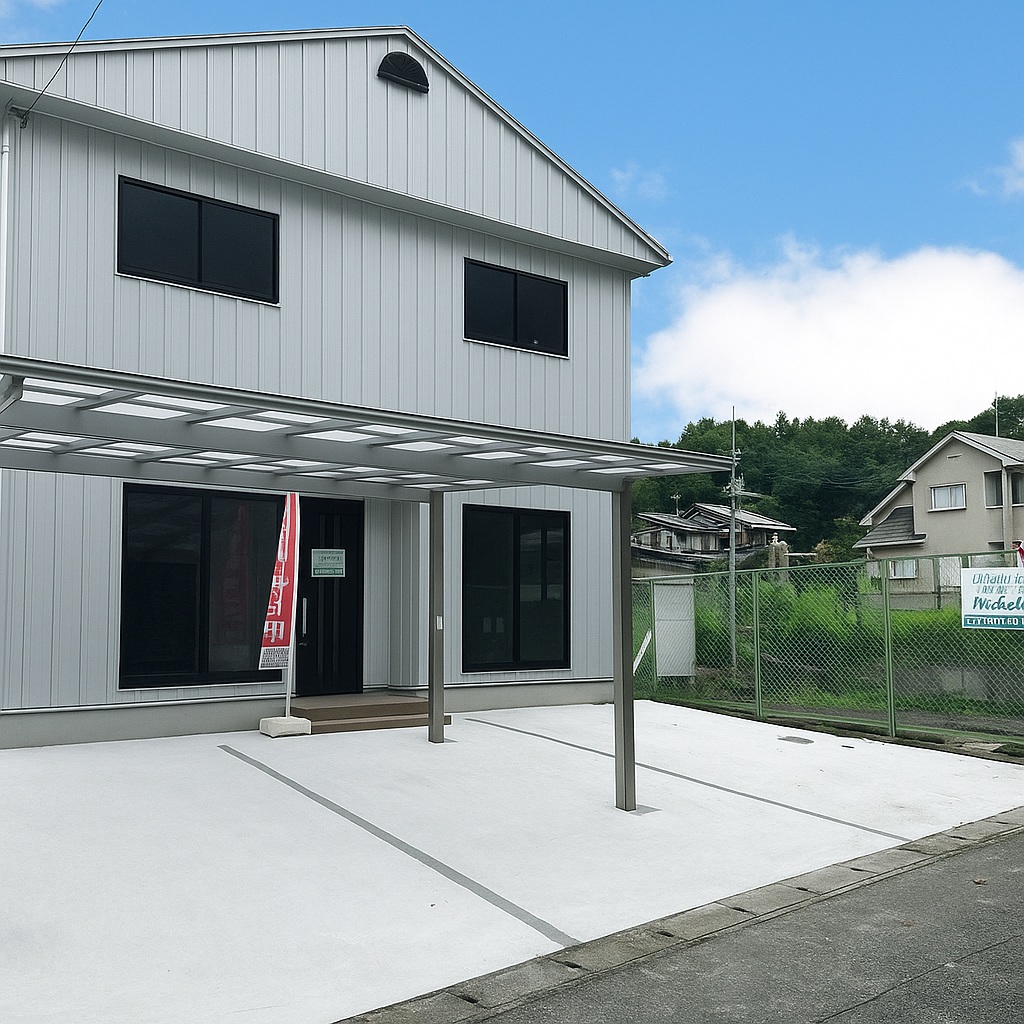 【外壁塗装イメージ図】 外壁をガルバリウムを張ったイメージ画像です。屋根カバー工法完了しました。 駐車場コンクリート、カーポート設置工事完了しました。
