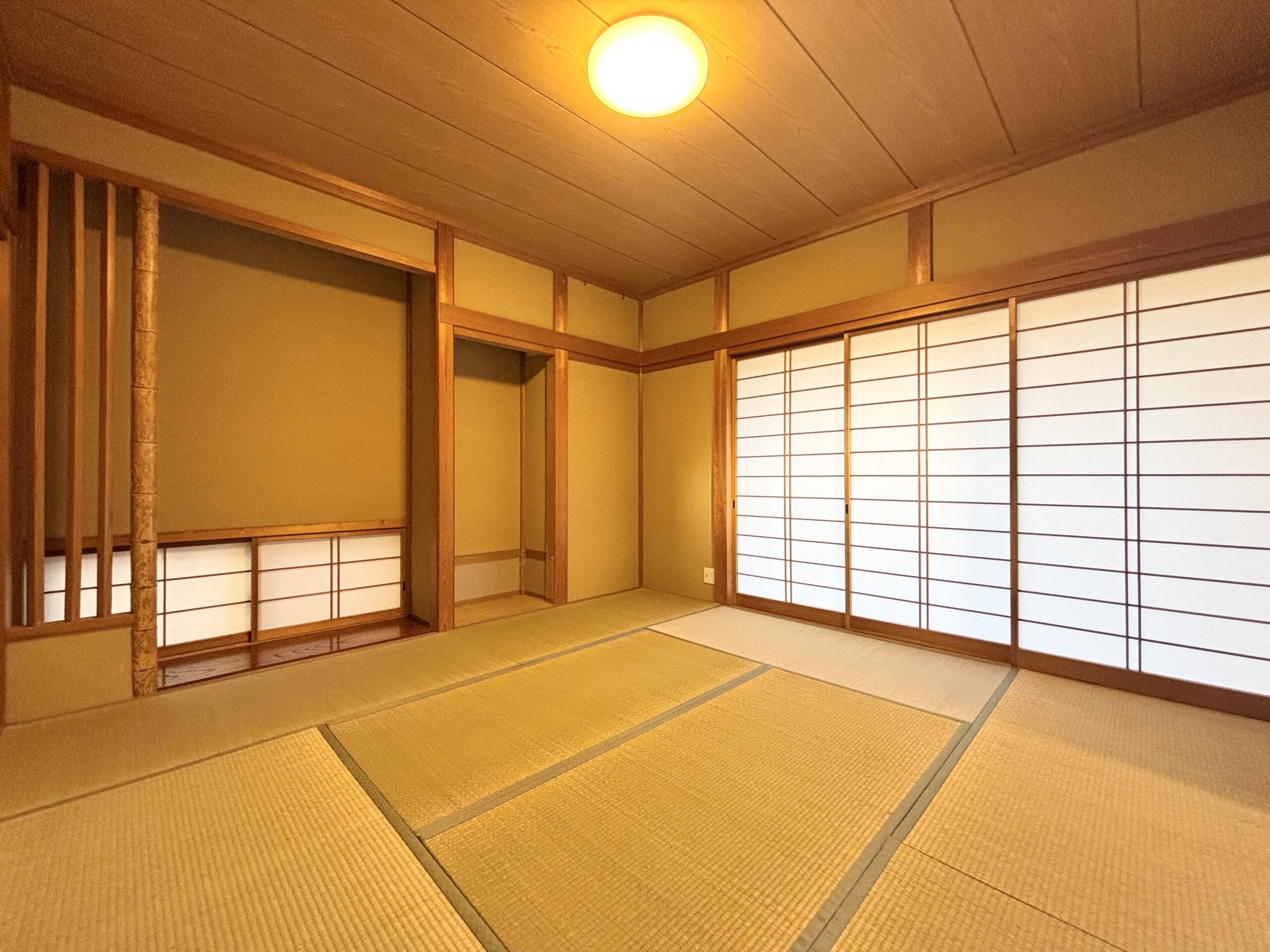 【リフォーム後】畳表替え、障子・襖交換、クロス張替えして綺麗になりました。木の柱や天井板など和の温かみを感じられますね。低い位置の窓からも外が見えるので、座ってくつろいでいても景色が目に入ります。