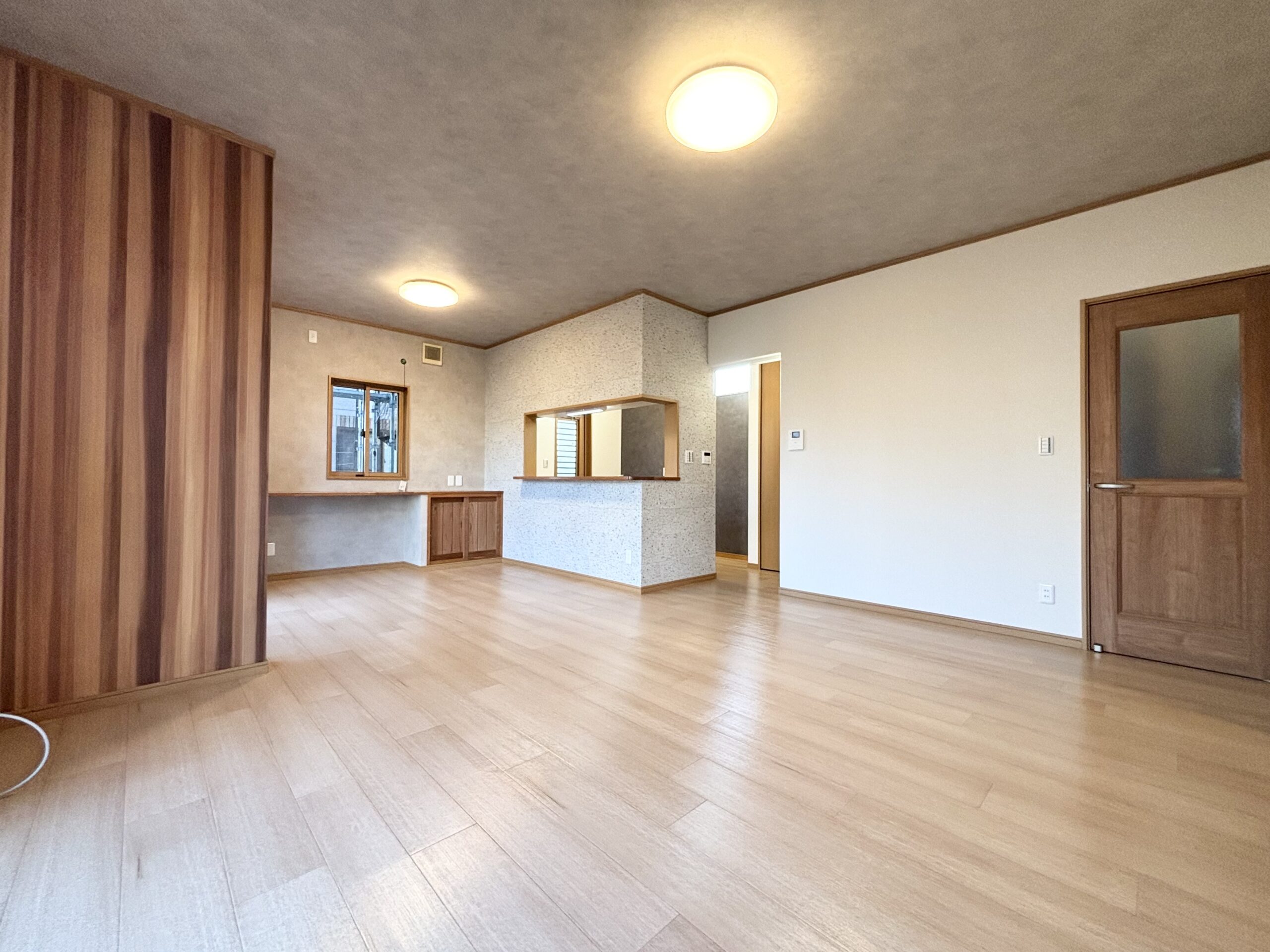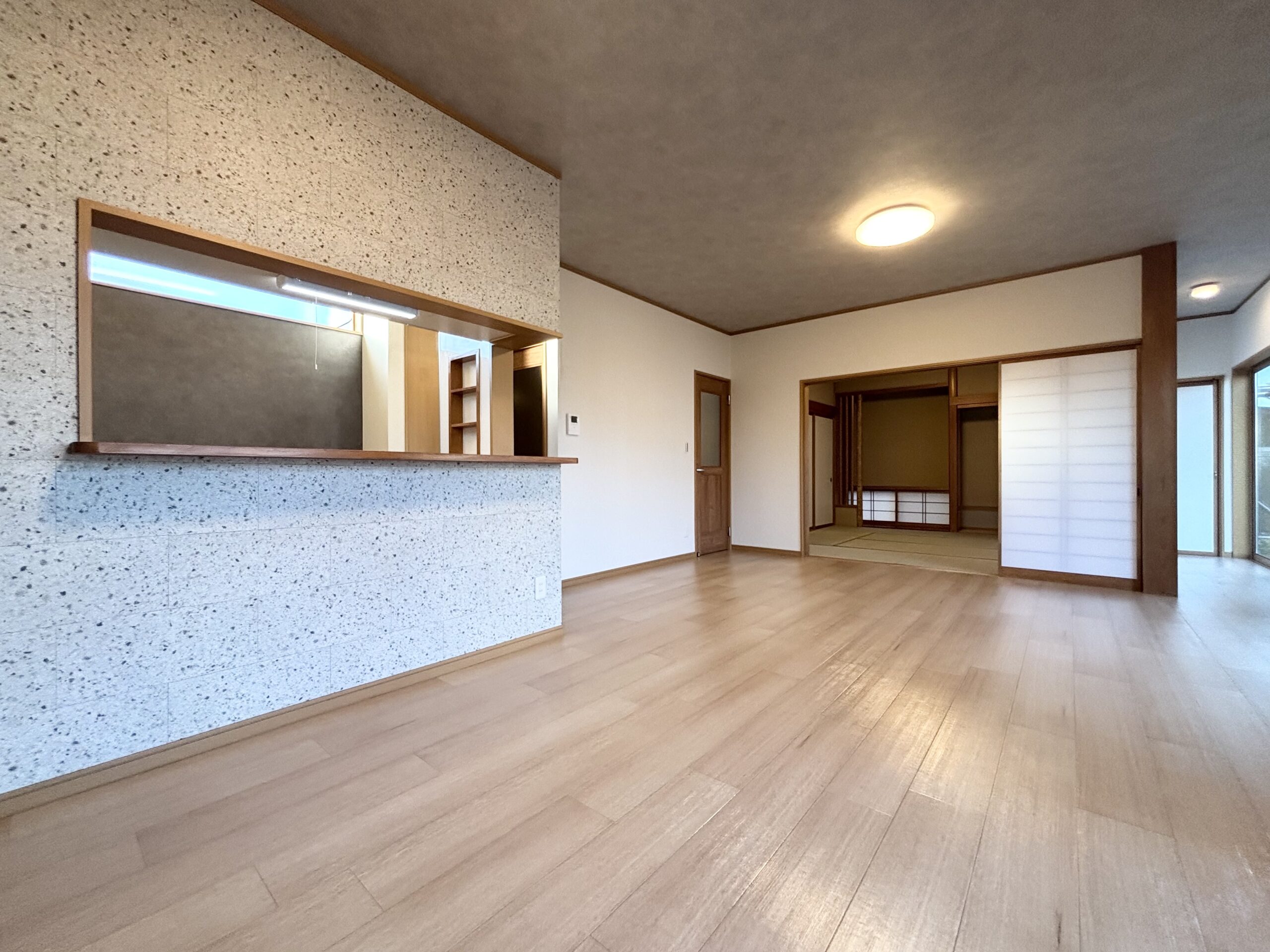 【リフォーム後】 クロス張替え、クッションフロア上張りで綺麗になりました。LDKと和室が隣接しているので、空間広々です。カウンターキッチンは南向きで明るい気持ちでお料理が出来ますね♪