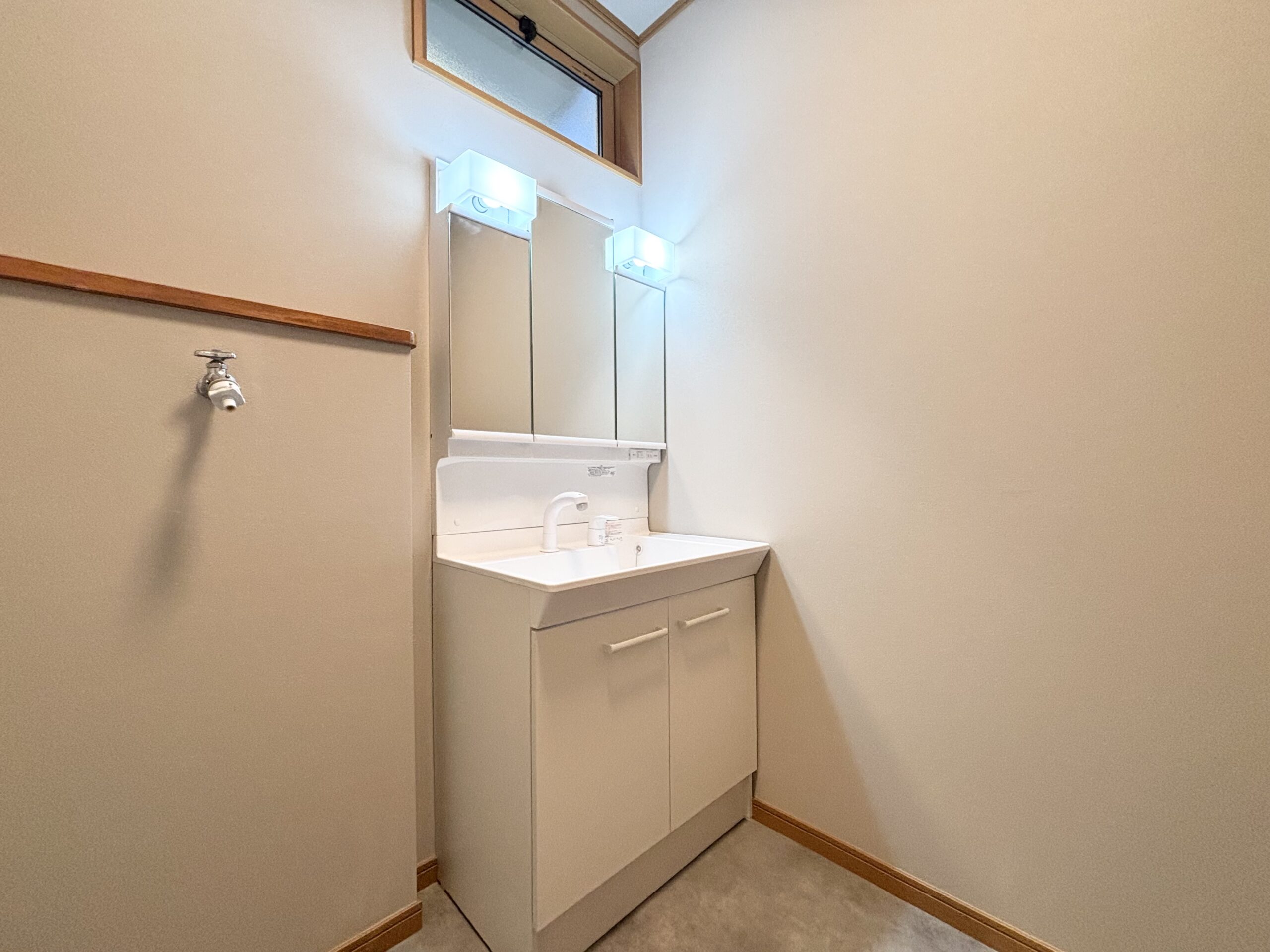 【リフォーム後】クロス・クッションフロア張替え/洗面化粧台新品交換しました。 新品交換したLIXIL製の洗面台です。LEDの照明付きで明るく使いやすい洗面台です。シャワーハンドルで朝シャンもできますね