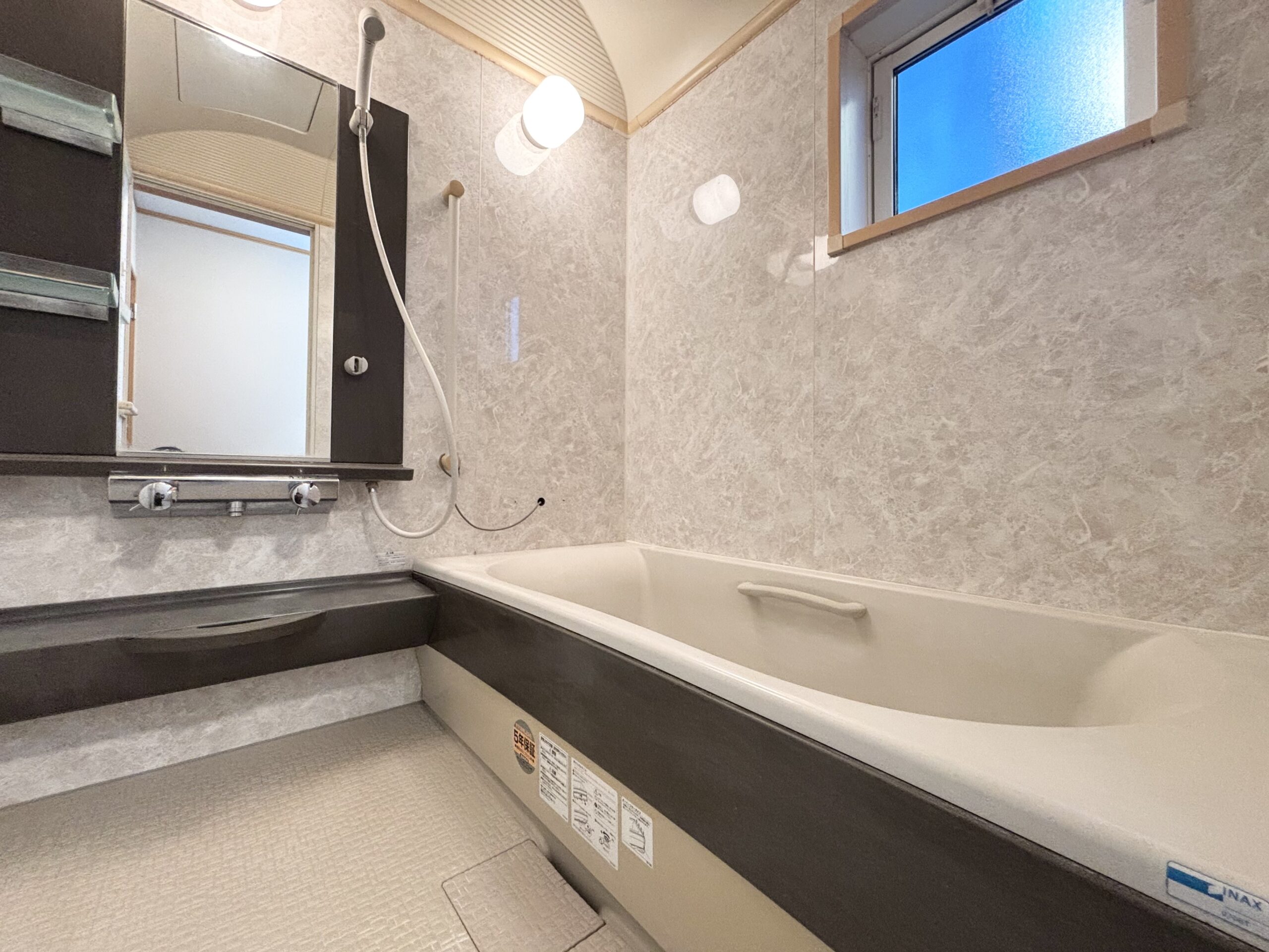 【リフォーム後】 ハウスクリーニングして綺麗になりました。デザインクロスが素敵な広々バスルームです。高窓で外からの目線も気にせずゆっくりバスタイムを過ごせます。
