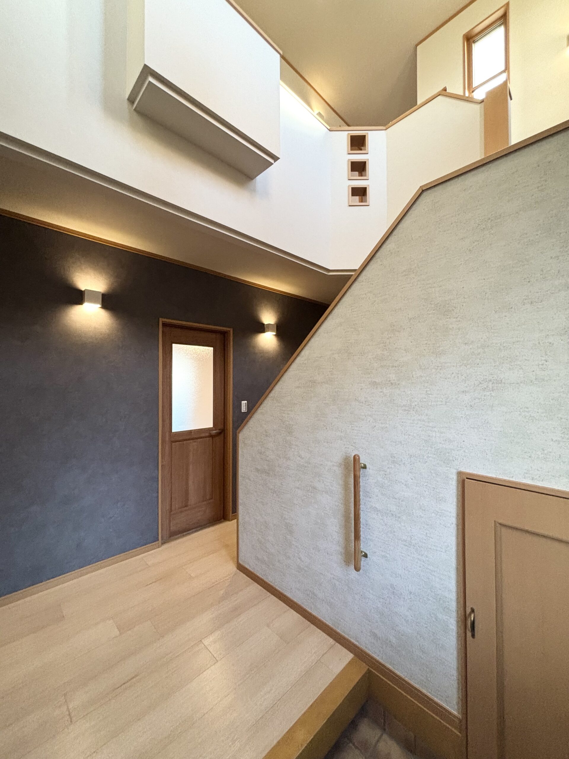 【リフォーム後】 クロス張替え、クッションフロア上張りで綺麗になりました。玄関は吹抜けになっているので、明るく開放的です。正面のデザインクロスがぐっと引き締まった印象になりました。
