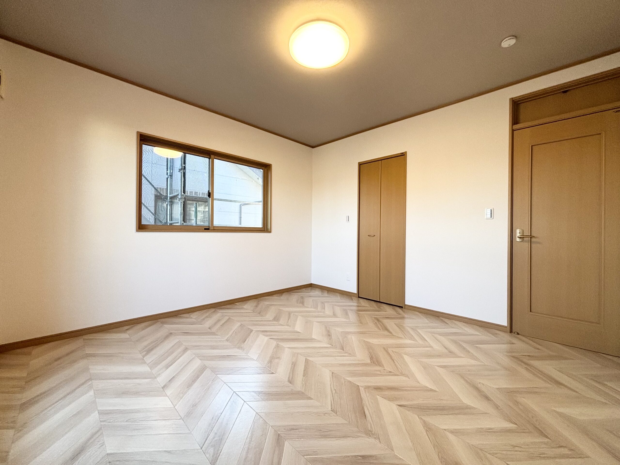 【リフォーム後】クロス・クッションフロア張替えで綺麗になりました。2階8帖南西の洋室です。デザイン性のあるヘリンボーン柄の床にしました。でシャープでスタイリッシュな印象です。
