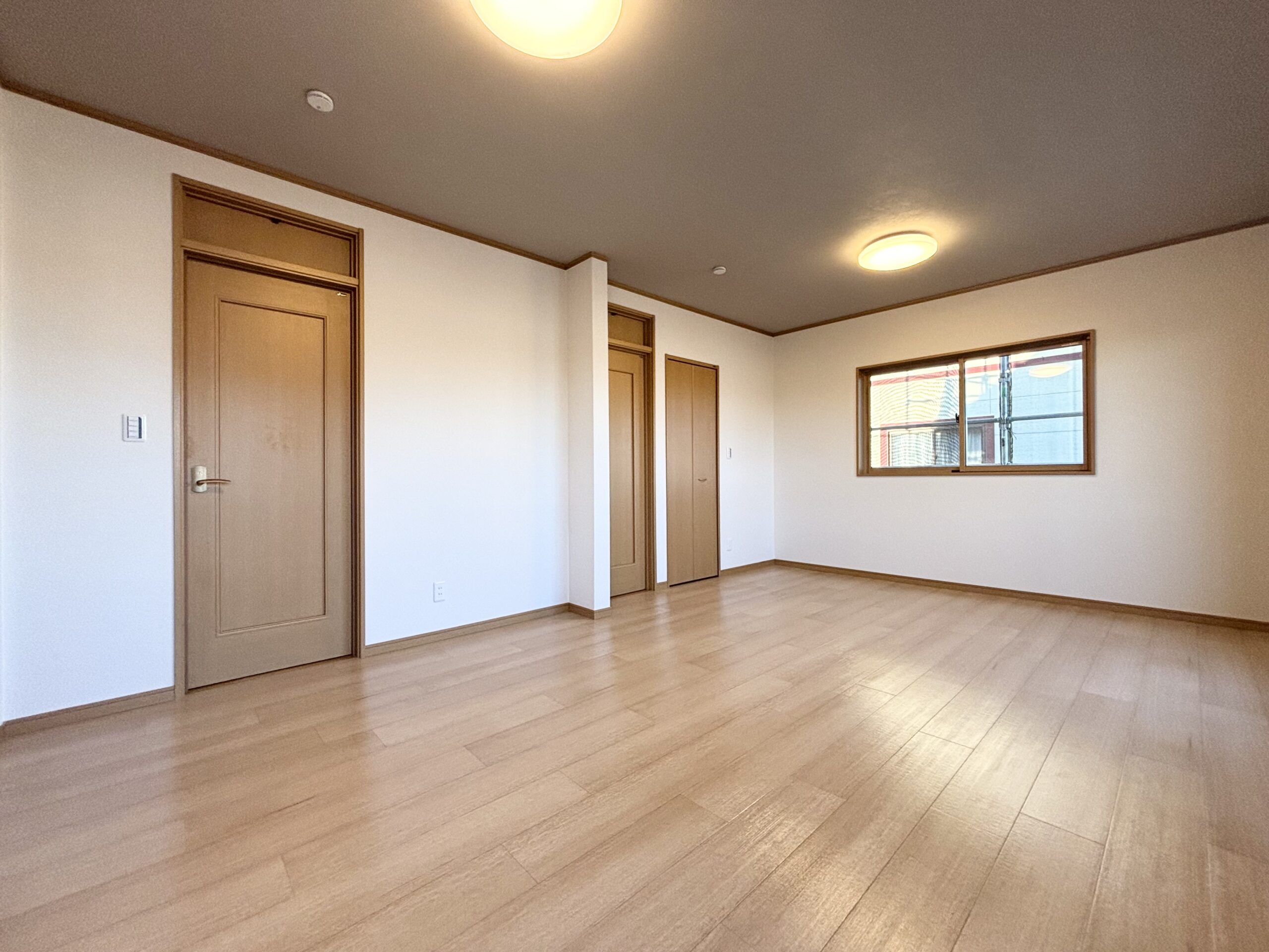 【リフォーム後】クロス・クッションフロア張替えで綺麗になりました。2階6×2室の洋室です。将来的に二部屋に分けられるようにドア、収納、窓もそれぞれ付いています。