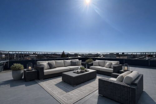 【スカイバルコニーイメージ画像】 実際の写真に家具を配置したイメージ画像です(実際に家具はつきません)。 この屋上の景色は実際の物です♪開放的で気持ちいいスペースですね!