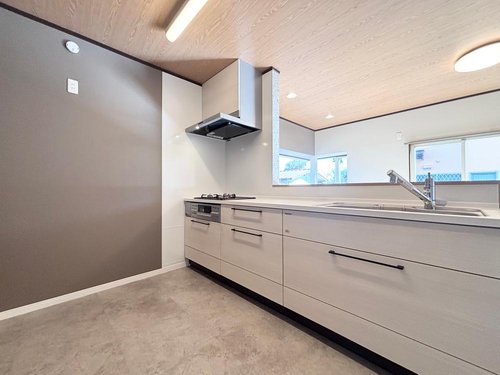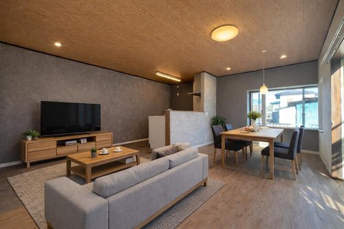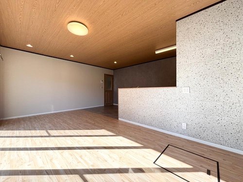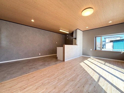 【リフォーム完了】 1階16.5帖のLDKです。クロス張替え、水廻り新品交換、照明器具交換、床張替えで綺麗になりました。グレー系のクロスと天井の木目で空間全体が優しく落ち着いた印象になりました。