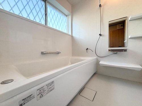 【リフォーム完了】 1階浴室です。新品交換しました。水廻りは白で統一しました。足を伸ばしてくつろげるサイズ感、毎日の疲れをしっかり癒せます。高い位置の窓で自然光が入り、湿気・カビ対策にも◎。