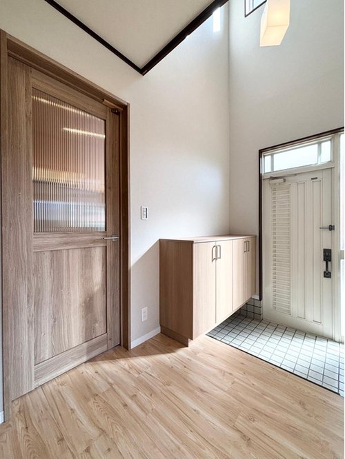 【リフォーム完了】 クロス張替え、床張替えで綺麗になりました。リビング扉も新品交換しています。白い玄関ドアとう優しい木目がマッチしています。吹抜け上部窓から日差しが降り注ぐ明るい玄関です。