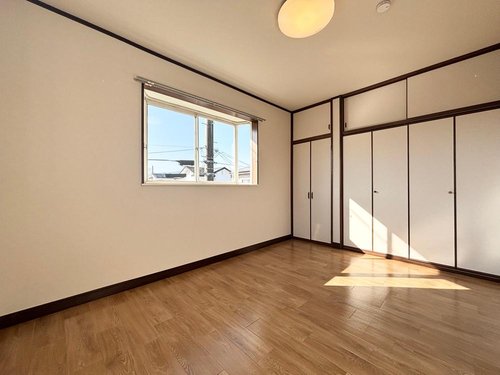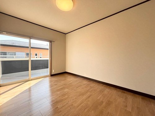 【リフォーム完了】 2階真ん中洋室6帖です。クロス張替え、照明器具交換、床張替えで綺麗になりました。バルコニーに面した掃き出しの窓から明るい日差しが降り注ぎます。