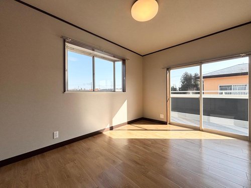 【リフォーム完了】 2階東南洋室6帖です。クロス張替え、照明器具交換、床張替えで綺麗になりました。バルコニーに面した掃き出しの窓と東側の窓から明るい日差しが降り注ぎます。