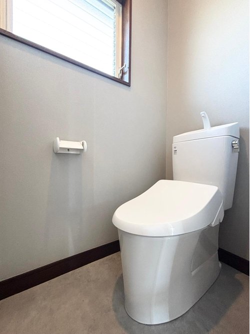 【リフォーム完了】 2階トイレです。クロス張替え、温水洗浄便座新品交換、床張替えで綺麗になりました。LIXILアメージュ便器の特徴は、アクアセラミックを使い水アカの固着を科学的に防ぎます。